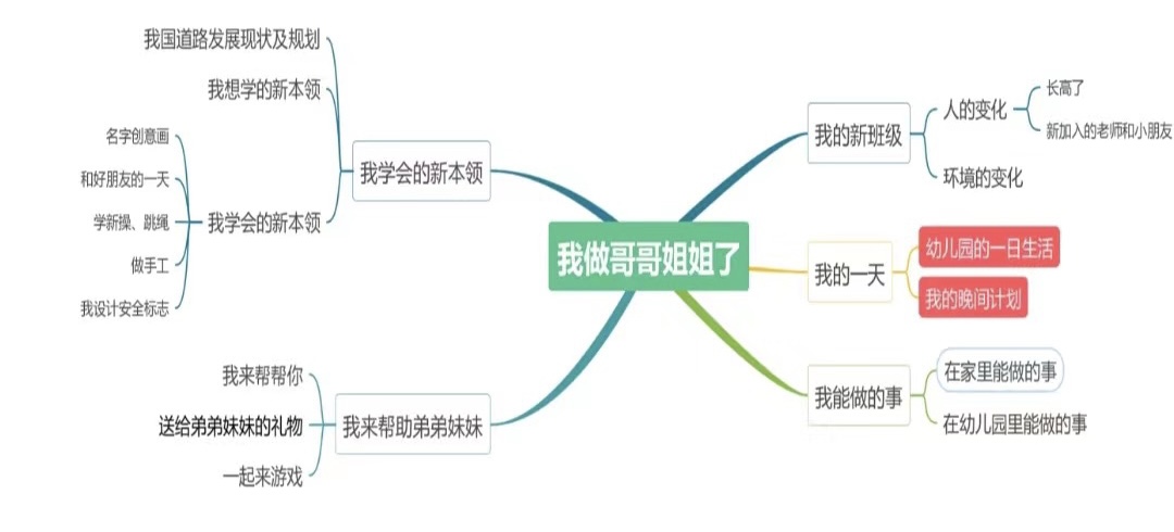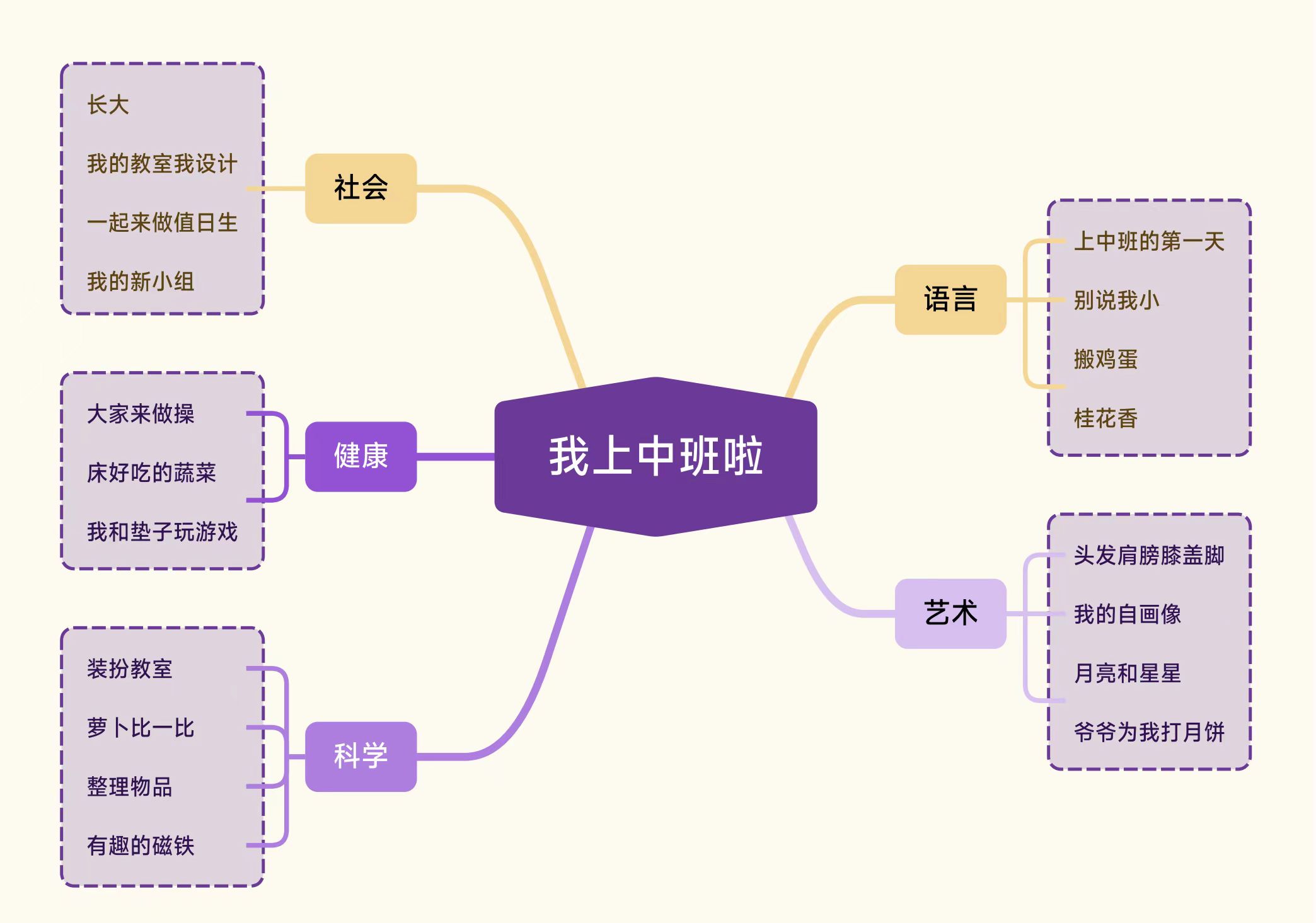 中班组老师从幼儿年龄特点、兴趣需要和发展水平出发,认为“我上中班啦”这一主题蕴含着丰富的学习与发展的契机。对可能生发的主题课程内容进行了细致梳理。利用思维导图的形式从幼儿能力水平和发展需要出发,各抒己见。