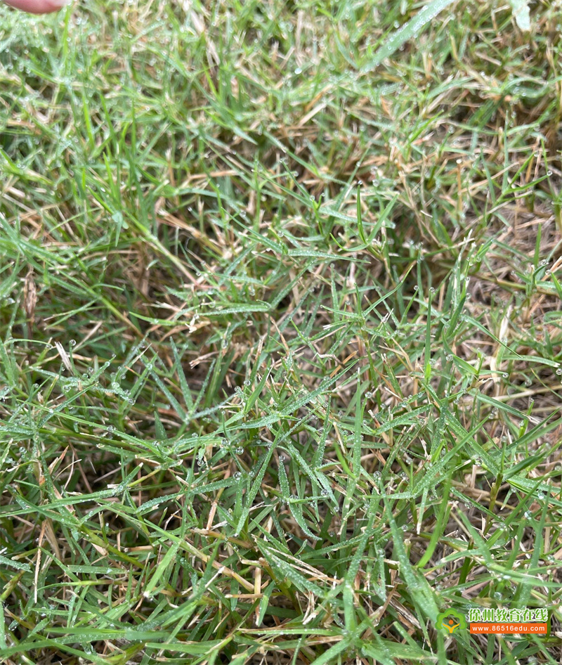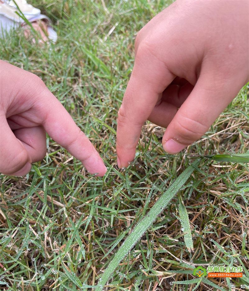 我发现了!在草地里。小草上全部都是晶莹剔透的露珠!