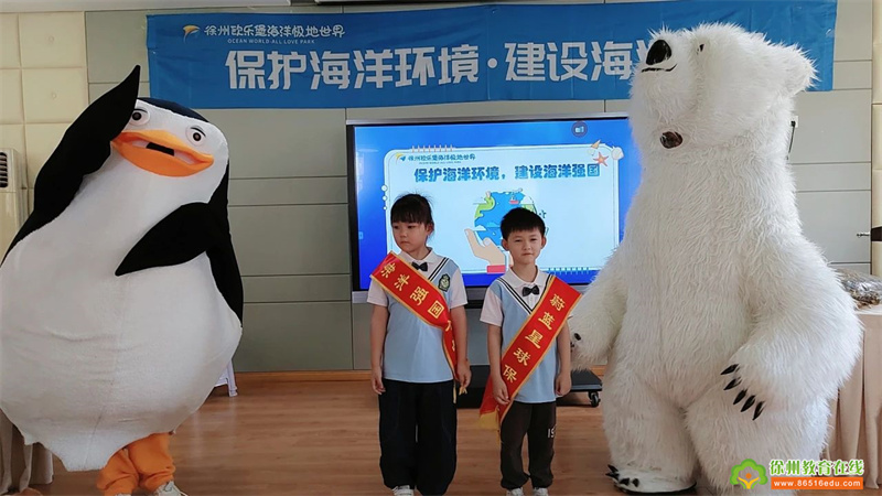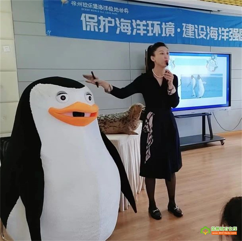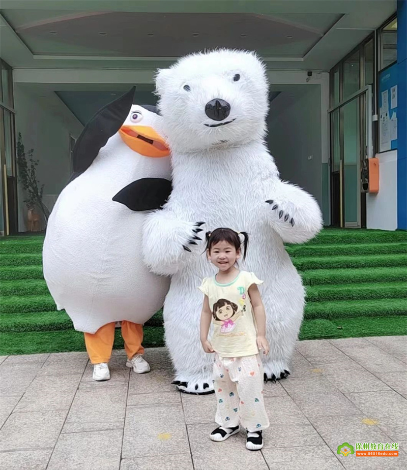 首先,白白胖胖的北极熊和活泼可爱的小企鹅在操场上和孩子们互动。