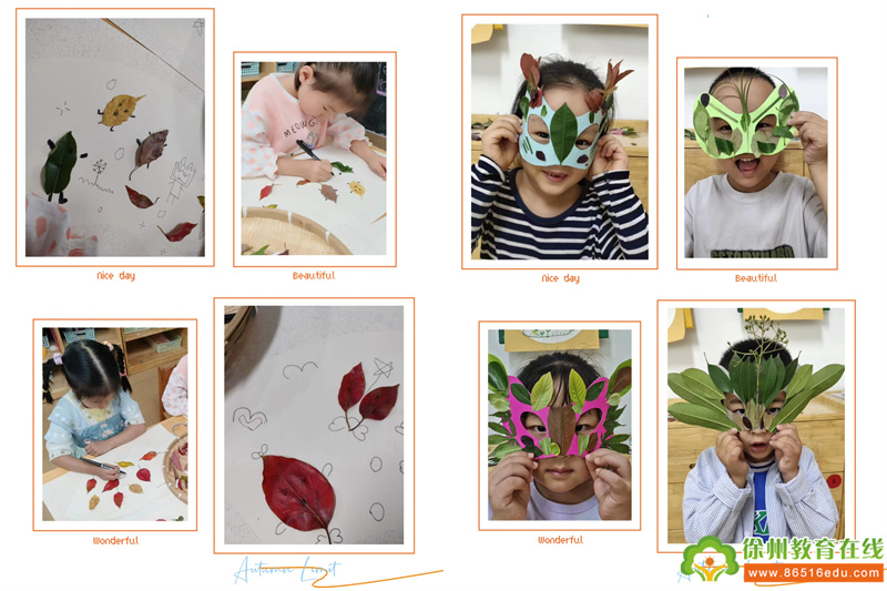 秋分之时,风景秀丽,天高云淡。大班组小朋友一起走出幼儿园,寻找秋天的足迹。捡起秋天的落叶,秋日的风景带到教室里,小朋友以树叶为主要材料去想象、去创作,把它变成小面具;或是给它加上眼睛、鼻子、嘴巴、四肢,让它“动起来”。
