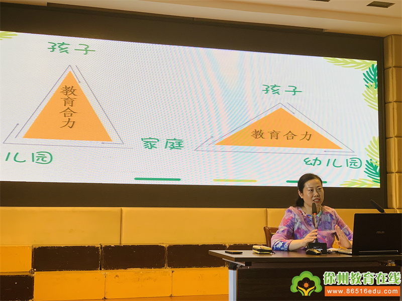 丁园长从园所环境设备、师资力量、食品安全、课程建设等方面介绍了园所基本情况,并运用等腰三角形教育模式,向家长生动形象地介绍了幼儿园和家庭如何形成最佳教育合力,促进孩子最优化发展与成长。