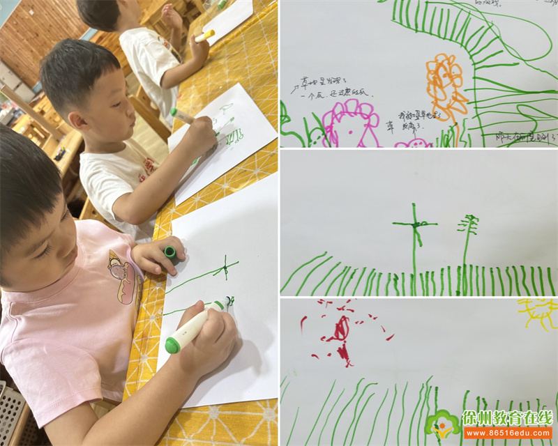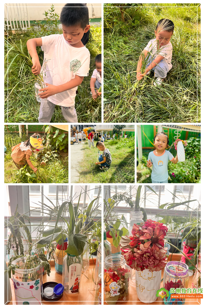在孩子们心灵手巧的造型中,精美的花草瓶呈现在我们眼前,高低错落,创意无限。回到教室后孩子们迫不及待的和小伙伴相互介绍自己的作品,用画笔记录下这样一次有趣的活动孩子们用插草的方式,感受了秋天赋予的美好,更好的建立了以植物为媒介的自然美学认知。