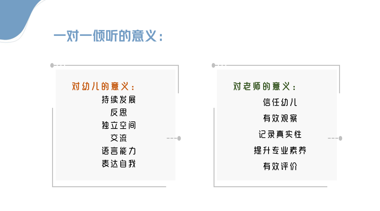 在本次活动前期我们针对小、中、大年级组的老师们在一对一倾听实施过程中遇到的问题进行了调研、汇总。老师们以年级组为单位,聚焦问题,结合幼儿年龄特点,进行头脑风暴。在智慧的碰撞后,老师们积极探讨,通过思维导图、结构图等方式分享自己关于一对一倾听的所思所想。