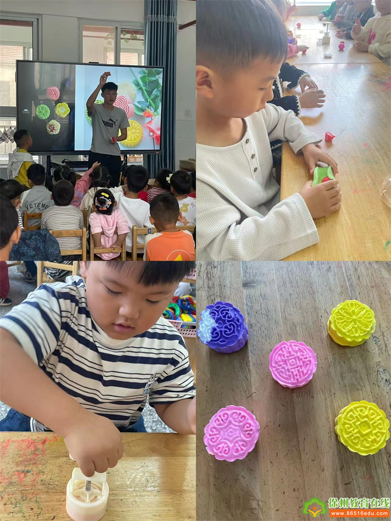 小班的孩子们通过和老师聊一聊、说一说,初步了解中秋节的时间、习俗、特点等,接着孩子们一起品尝美味的月饼,通过看一看、摸一摸、尝一尝了解了月饼的形状、图案、颜色、味道。中班小朋友在老师的帮助下用超轻粘土做月饼,孩子们通过揉、搓、捏等技法伴随着优美的音乐,一个个造型独特、色彩鲜明的月饼就做好了。大班的孩子们也用粘土做出了精致的月饼,和中班的弟弟妹妹相比唯一不同的是大班孩子用专业的月饼模具压出来各式各样的精美花纹,月饼做的惟妙惟肖。