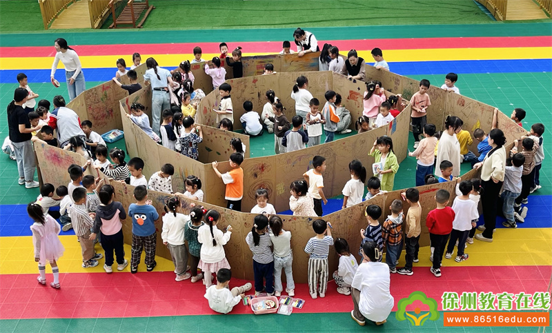 为了进一步激发小朋友的想象力与创造力,幼儿园在户外举行了迷宫涂鸦DIY活动,孩子们在纸板制作的迷宫里来回穿梭,宝贝们有的蹲着,有的趴着,虽然姿态各异,但是神情专注而认真,有的用画笔尽情挥洒,有的用彩笔涂鸦,有的用油画棒创意添画,五彩斑斓的色彩绘制出波澜壮阔的时代画卷。
