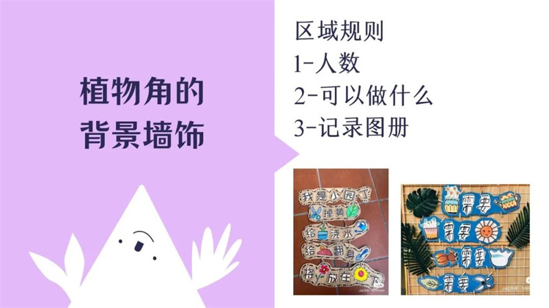 小班老师根据小班幼儿年龄特点,提供生长变化快、易于幼儿观察的动植物,用可爱的卡通形象吸引幼儿注意,便于幼儿在看一看、摸一摸中激发探究的兴趣,体现了儿童本位的理念,为幼儿营造了一种温馨、童趣的自然角氛围。