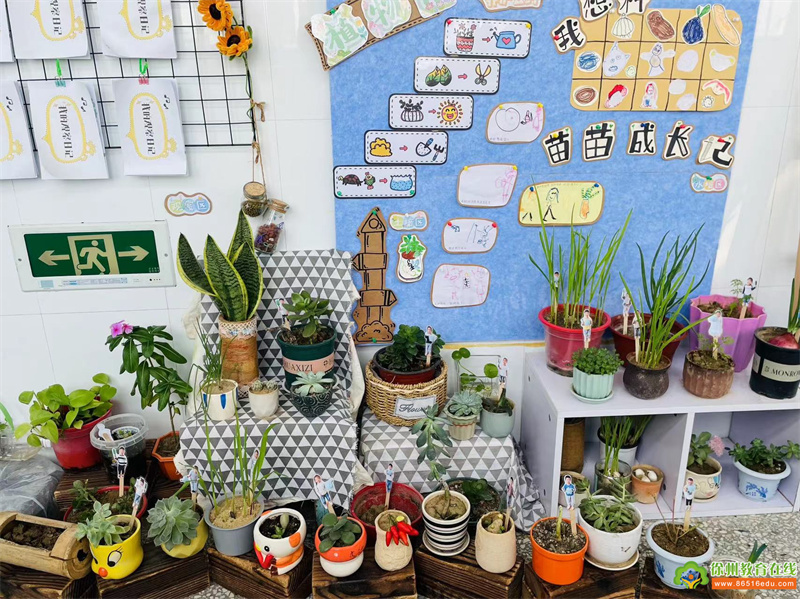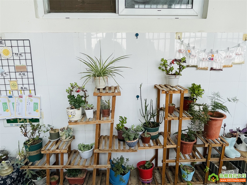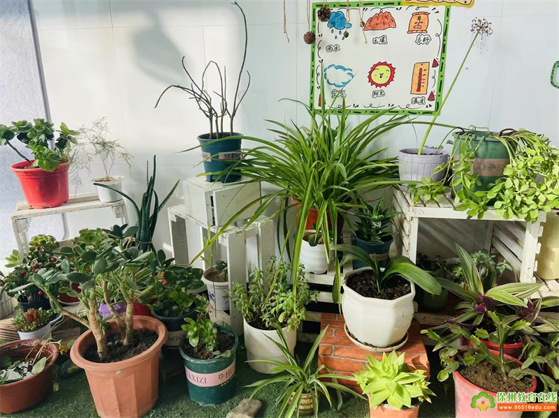 中班的自然角设置分明,种植区、观赏区、饲养区、实验区等应有尽有。同时,教师充分利用空间、墙面的作用,创设平面、立体的自然角环境,让自然角成为主体活动的小天地。