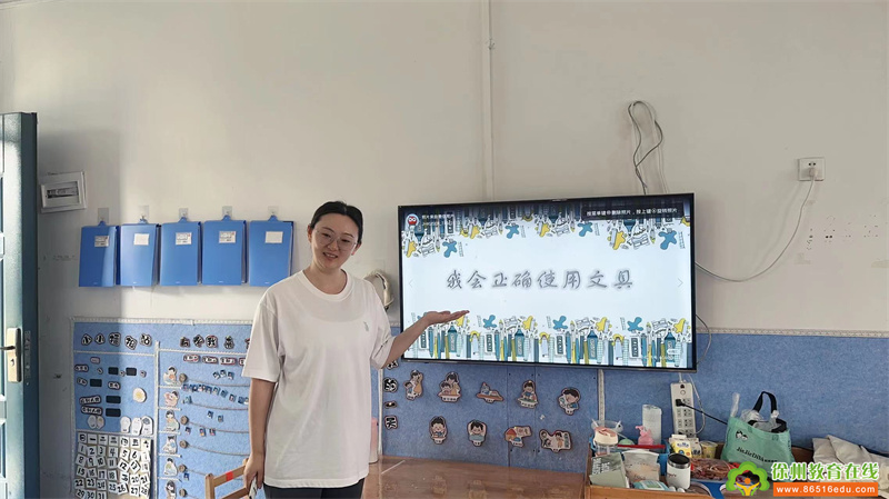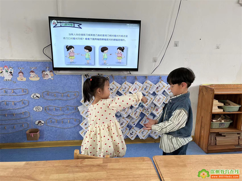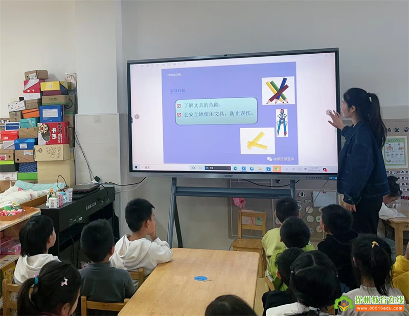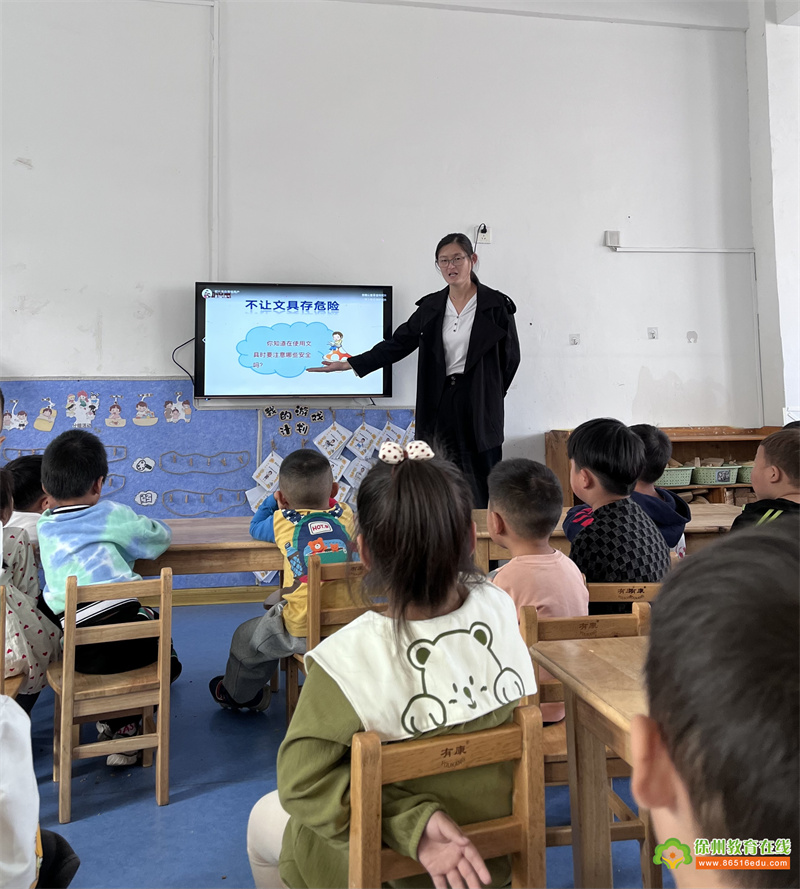 各班老师利用视频、图片、故事、儿歌等方式向孩子们介绍了文具的潜在危险和使用文具的安全注意事项。