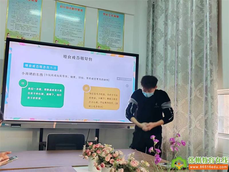 保健张老师在现场模拟了心肺复苏的全部流程和“海姆立克急救法”处理幼儿气道异物梗阻的方法,老师们认真学习,通过观察实际操练更加明确要领,加深印象。