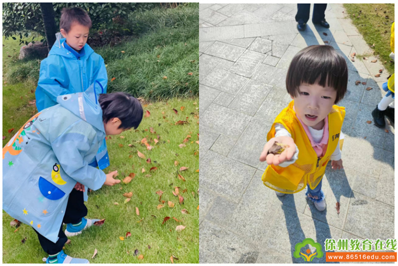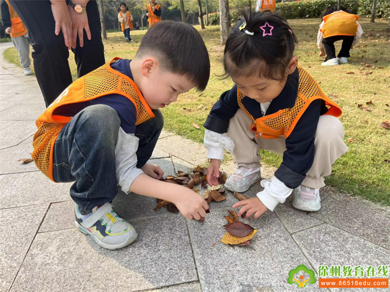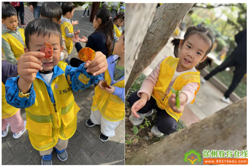 二实幼的孩子们一起在彭园里欣赏美丽的秋景,寻找色彩斑斓的树叶。