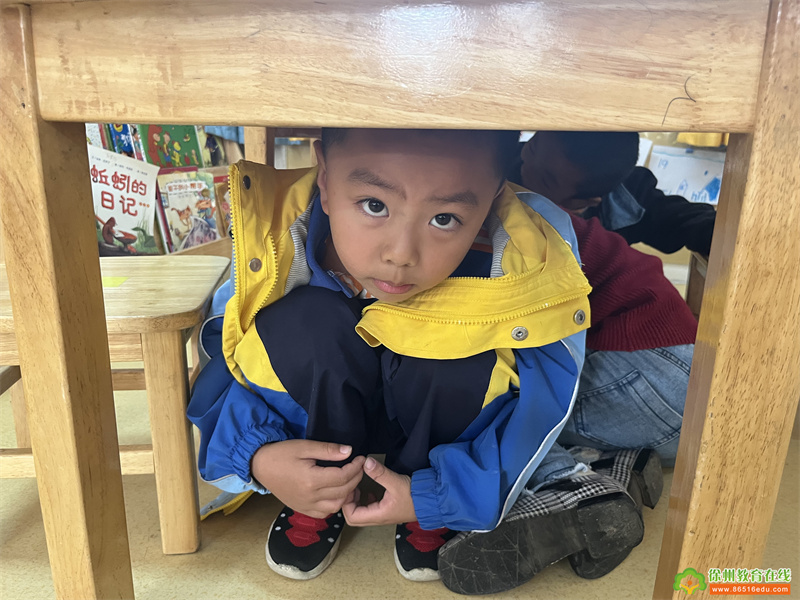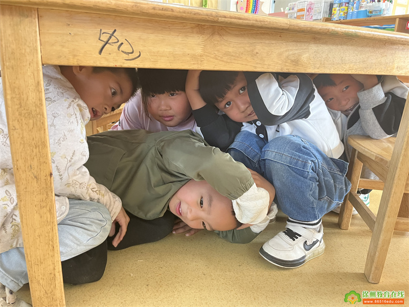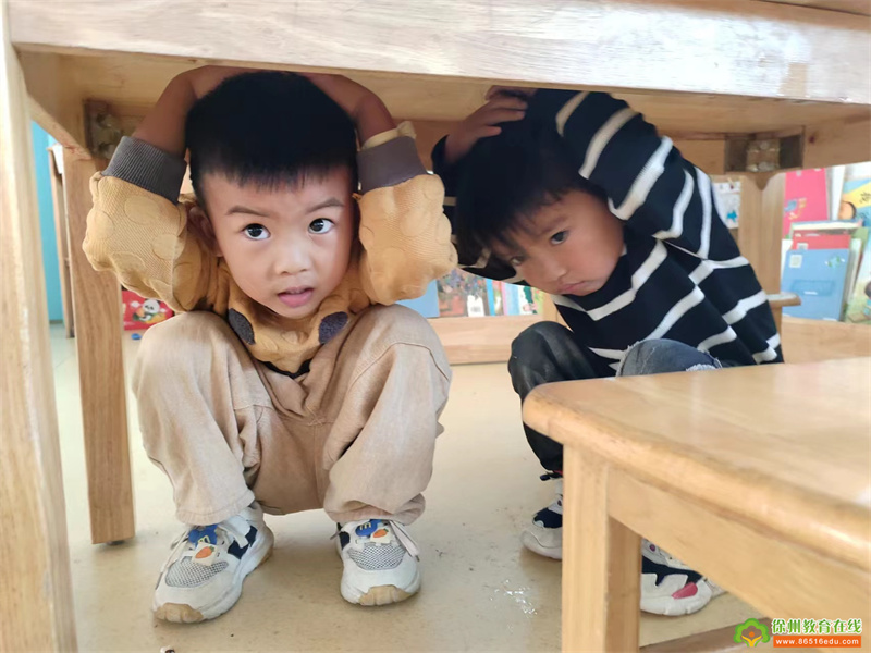 当地震警报声响起,防震演练正式开始,教师带领孩子们进行应急避震。桌子下、房间的墙角、坚固的三角区都是可以躲避的地方……孩子们还会用双手等物品保护头部,防止自己受伤。