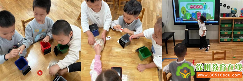 在幼儿园的一日活动中,幼儿们通过游戏活动、视频等多元形式让幼儿知道生活中的垃圾分为“厨余垃圾”“有害垃圾”“可回收垃圾”和“不可回收垃圾”。让幼儿学会了如何进行垃圾分类,给孩子幼儿的心灵播种下爱护环境的种子,从小做起,养成垃圾分类的好习惯。
