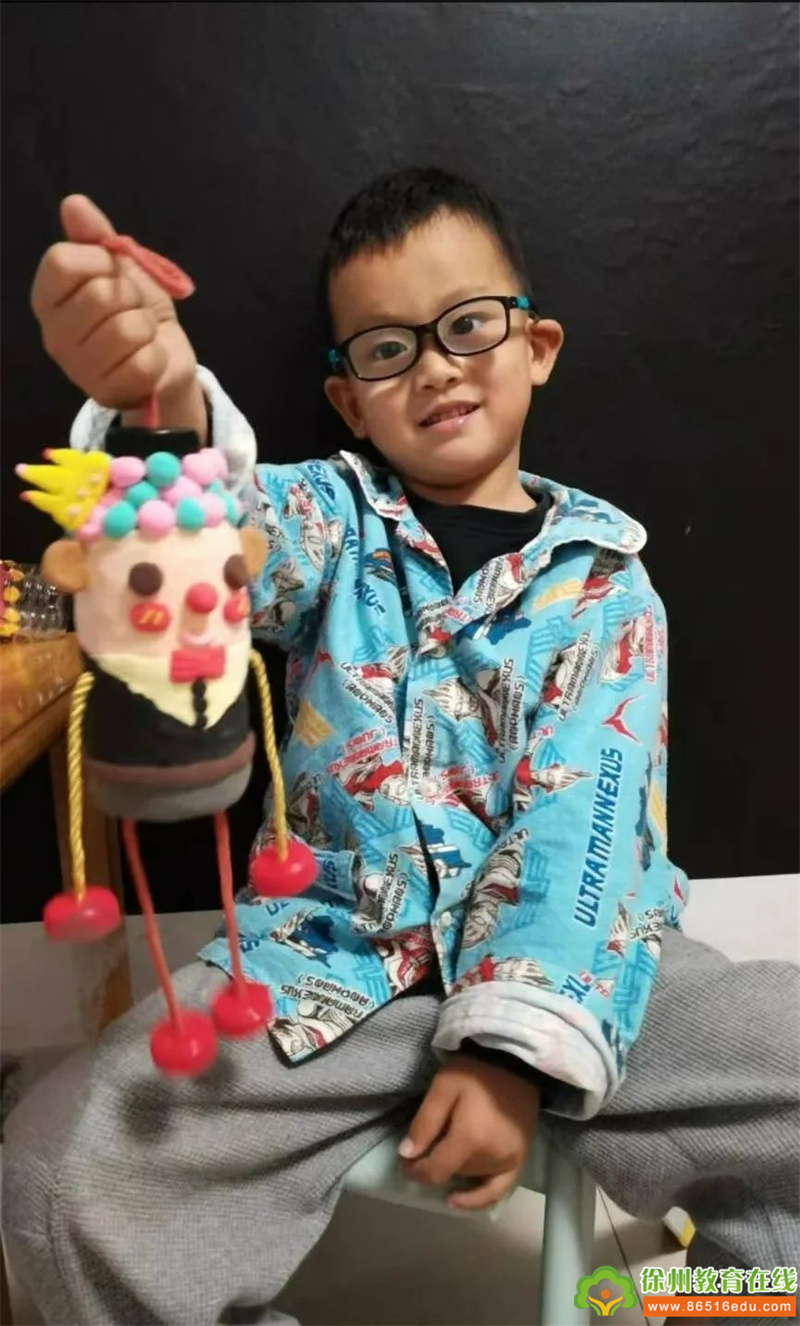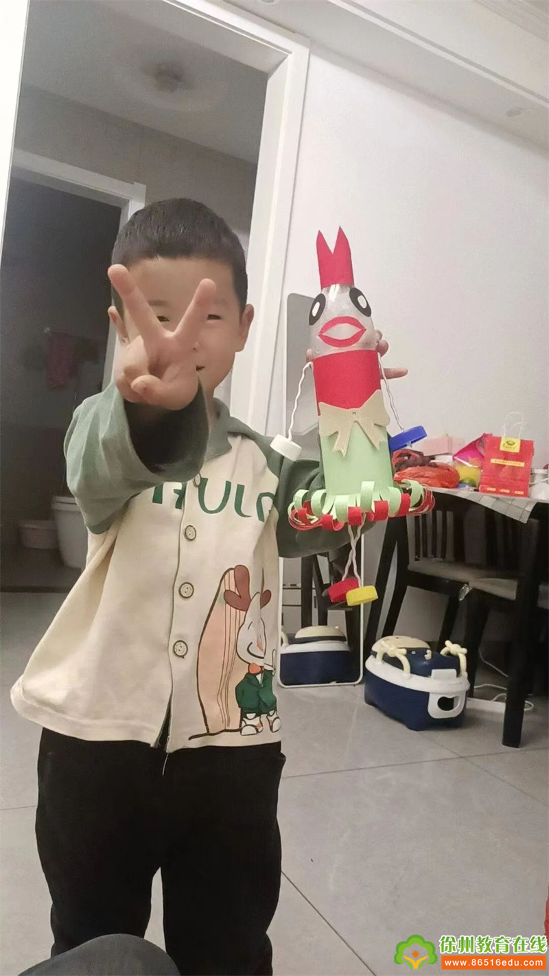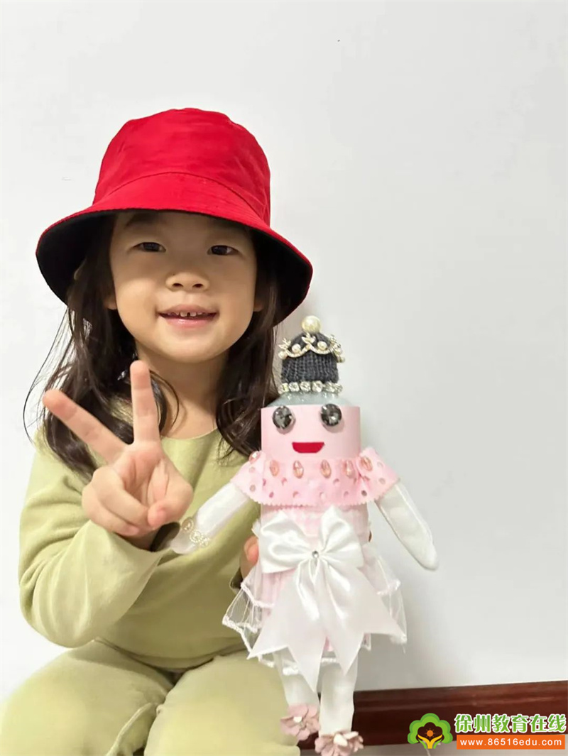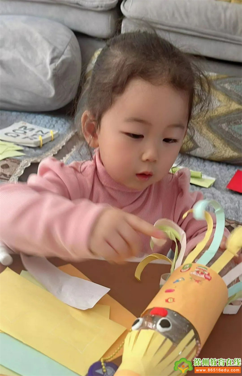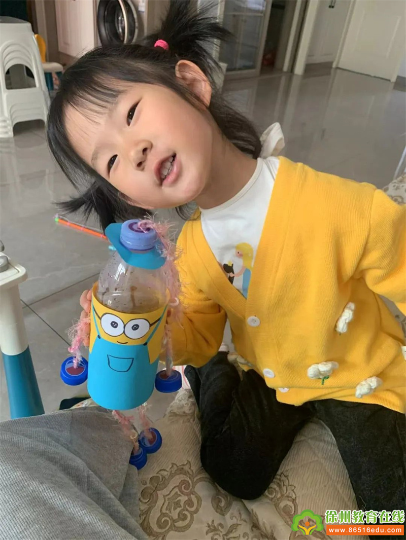 家长们和小朋友们一起利用废旧塑料瓶、瓶盖、绳子等废旧材料粘贴制作跳跳偶。