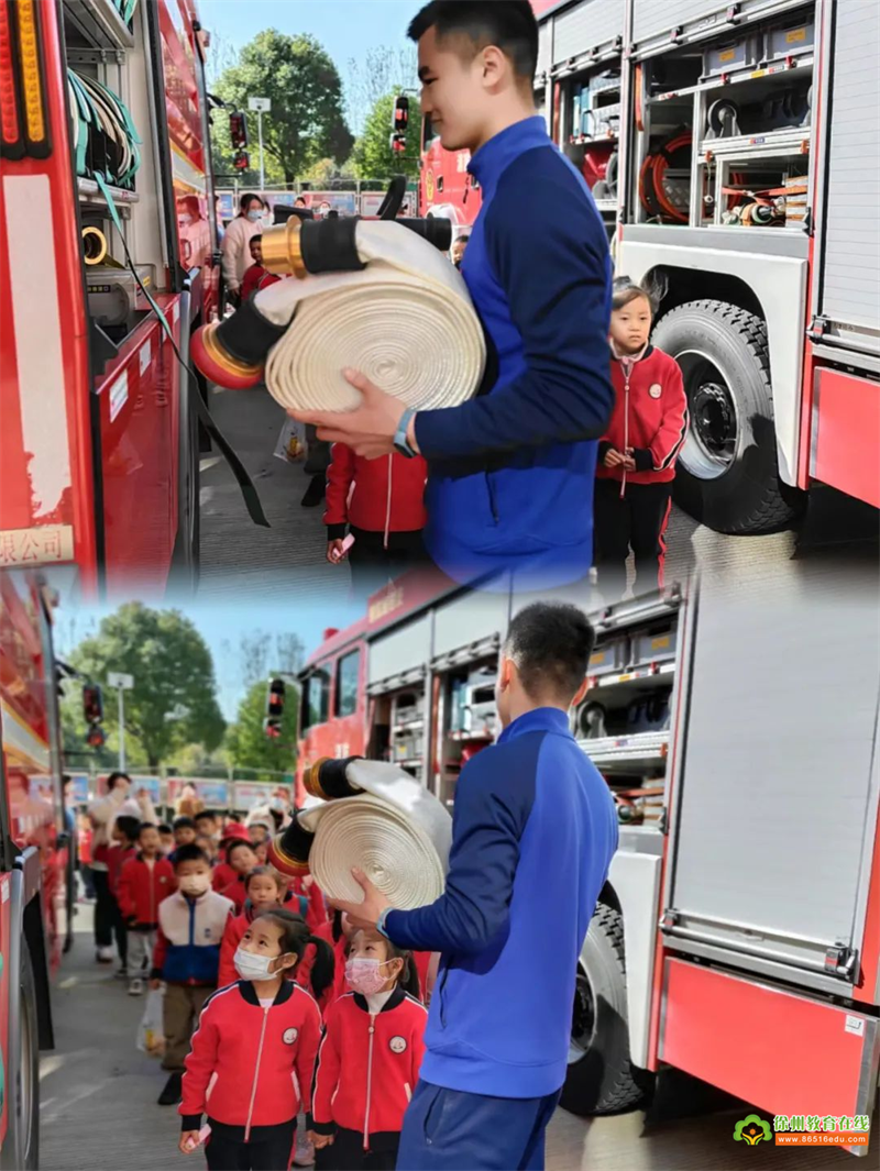 孩子们在消防员叔叔的带领下,围着消防车、消防用具和消防设备,这看看、那摸摸,充满了好奇。