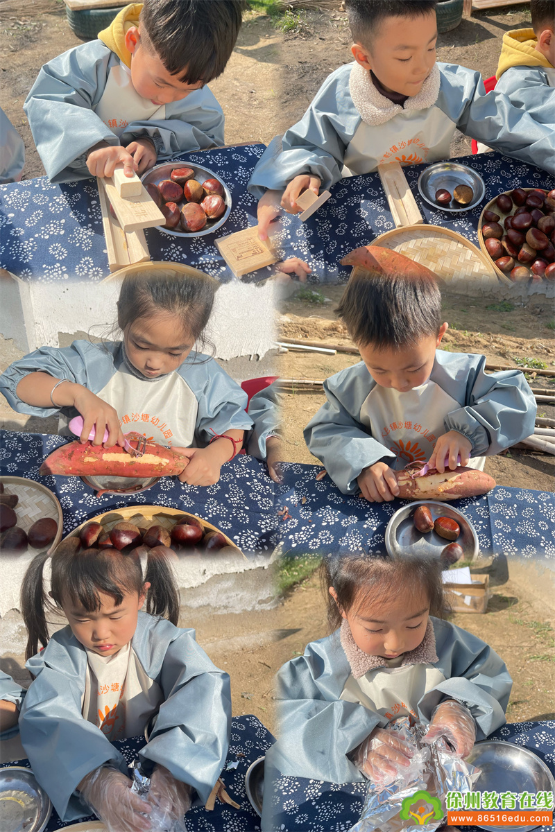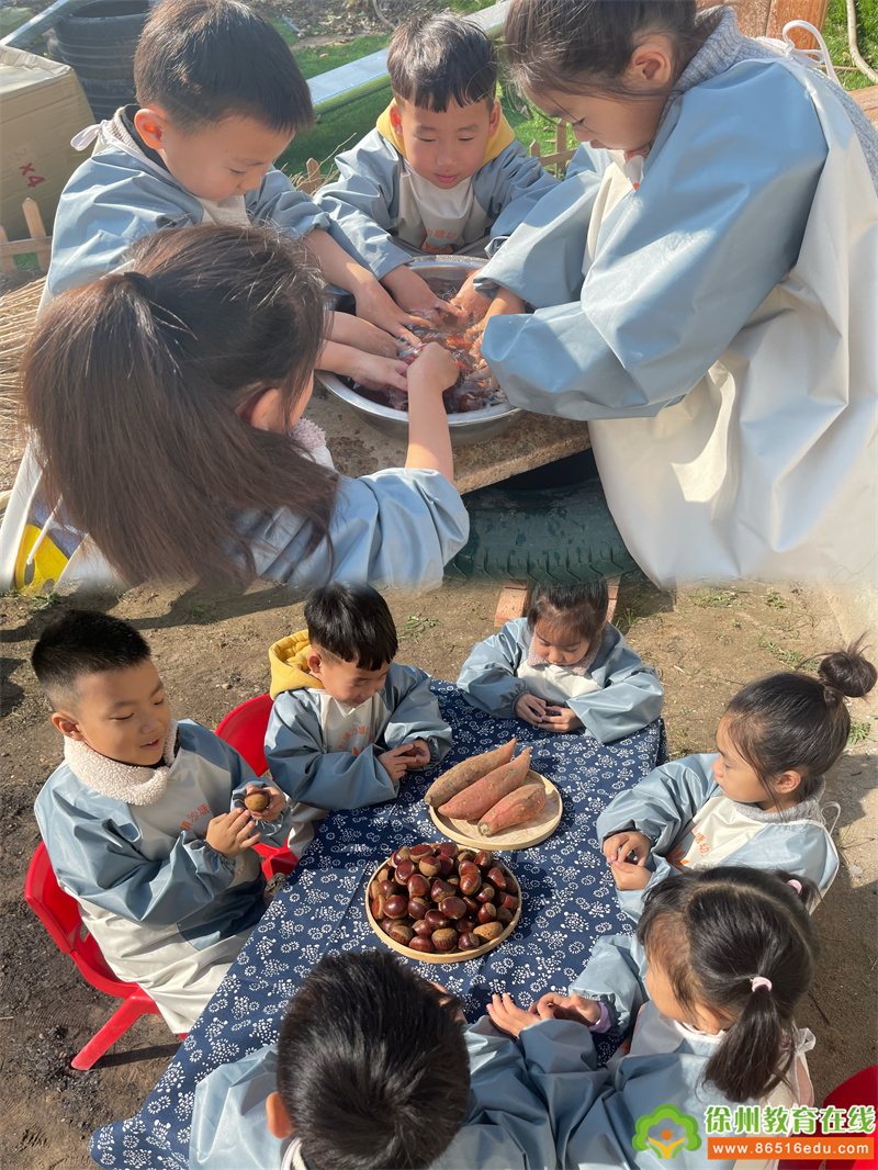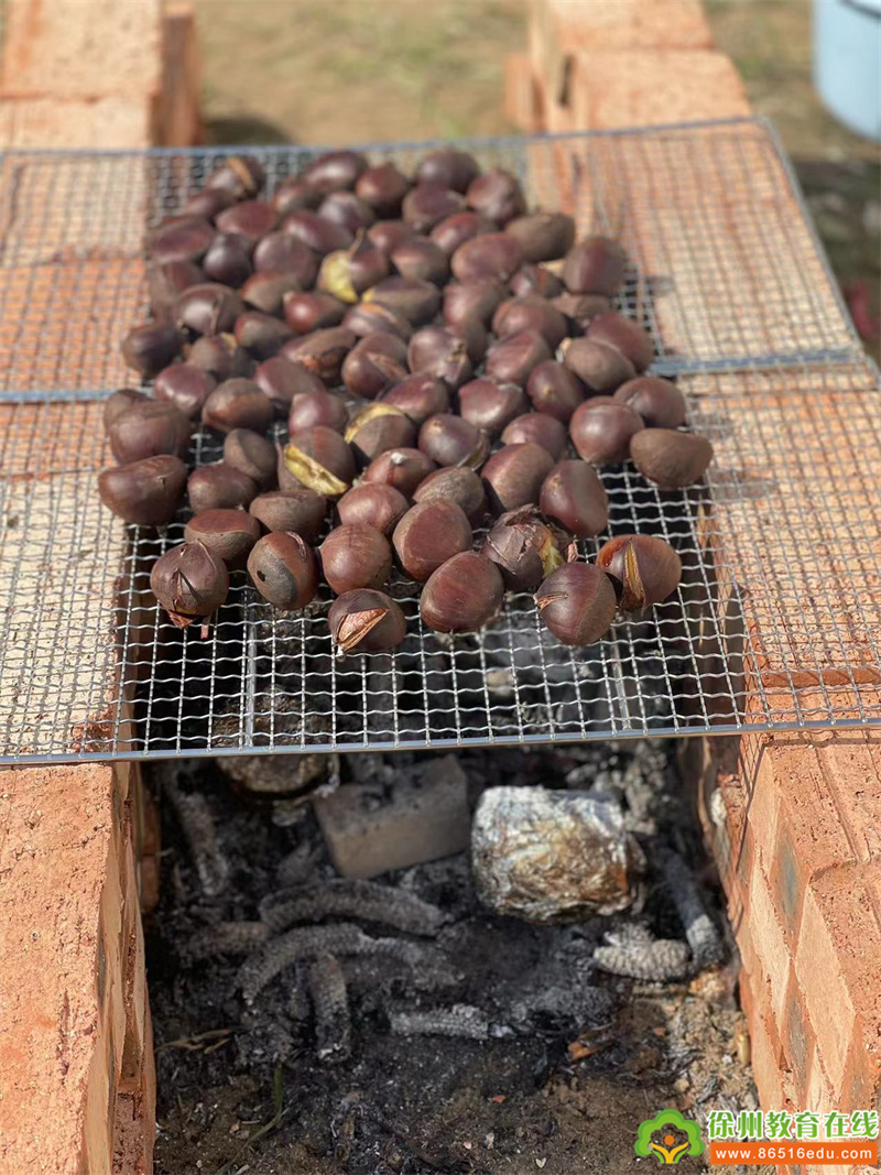 烤炉垒好了,孩子们开始清洗板栗和红薯,并将板栗用工具开口,将红薯去掉外皮包好锡纸,等老师把火引燃,就开烤啦!