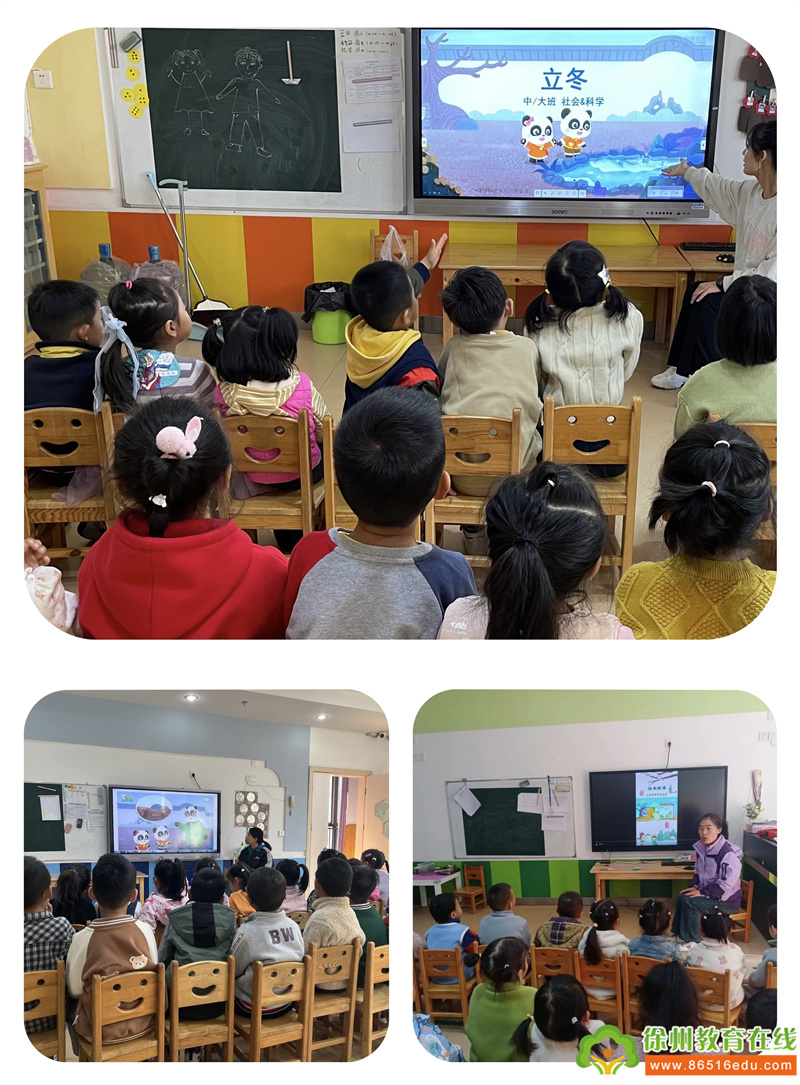 立冬有什么习俗呢?跟其他季节有着什么不一样的气候呢?根据孩子们的年龄特点,教师通过图片、视频、游戏、故事等多种形式向孩子们展示冬天的特征,引导孩子积极参与讨论关于冬天的话题,鼓励孩子表达自己的发现和想法,了解立冬的来历和习俗。