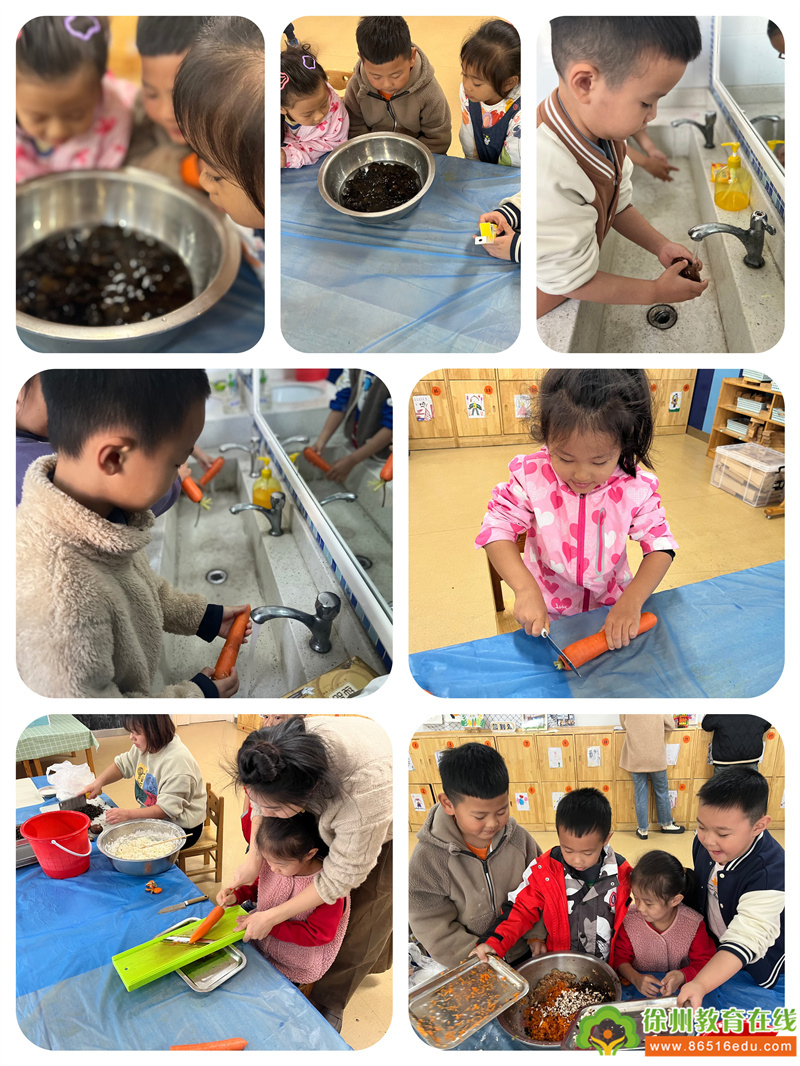 1.知道今天饺子馅用到的食材并清洗食材到调制饺子馅:
