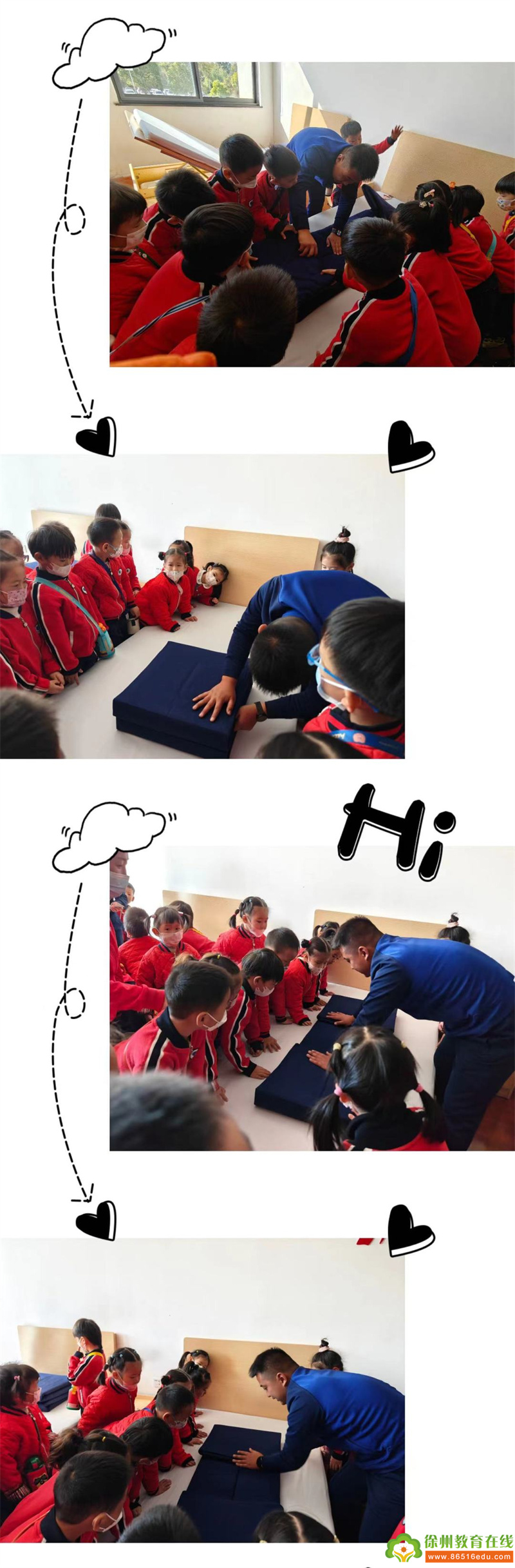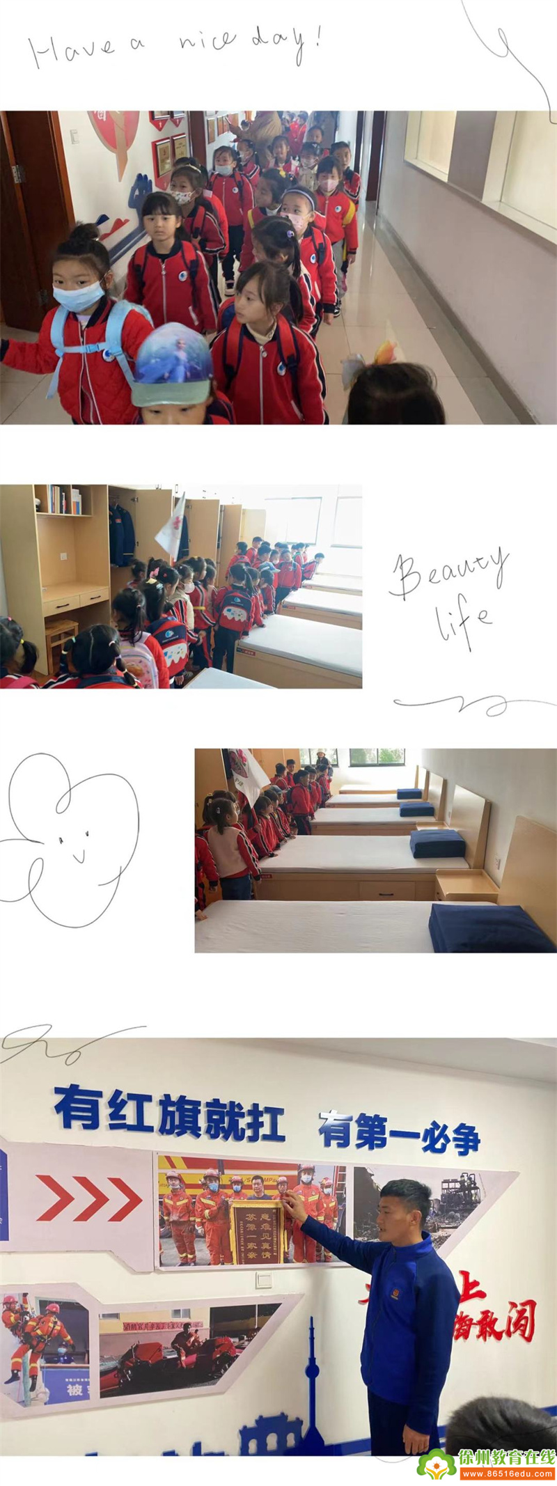 走进消防站二楼的生活区,孩子们参观了消防员叔叔的宿舍等地。