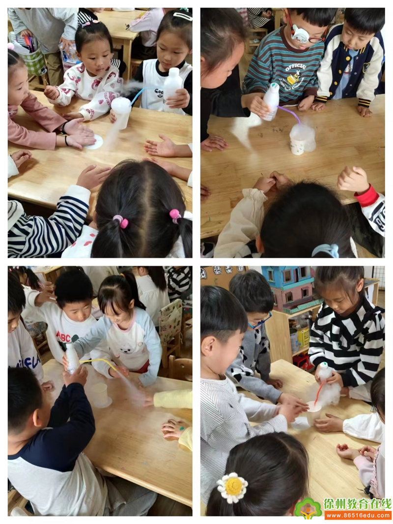 一听到这个名称,小朋友们就开始兴奋起来了,个个睁大眼睛,屏住呼吸......只见诺诺妈妈拿出一个装有水的杯子,往杯中放了一些粉末。霎时间,一股白色气体就直冲上天!过了一会儿,气体才渐渐散去。