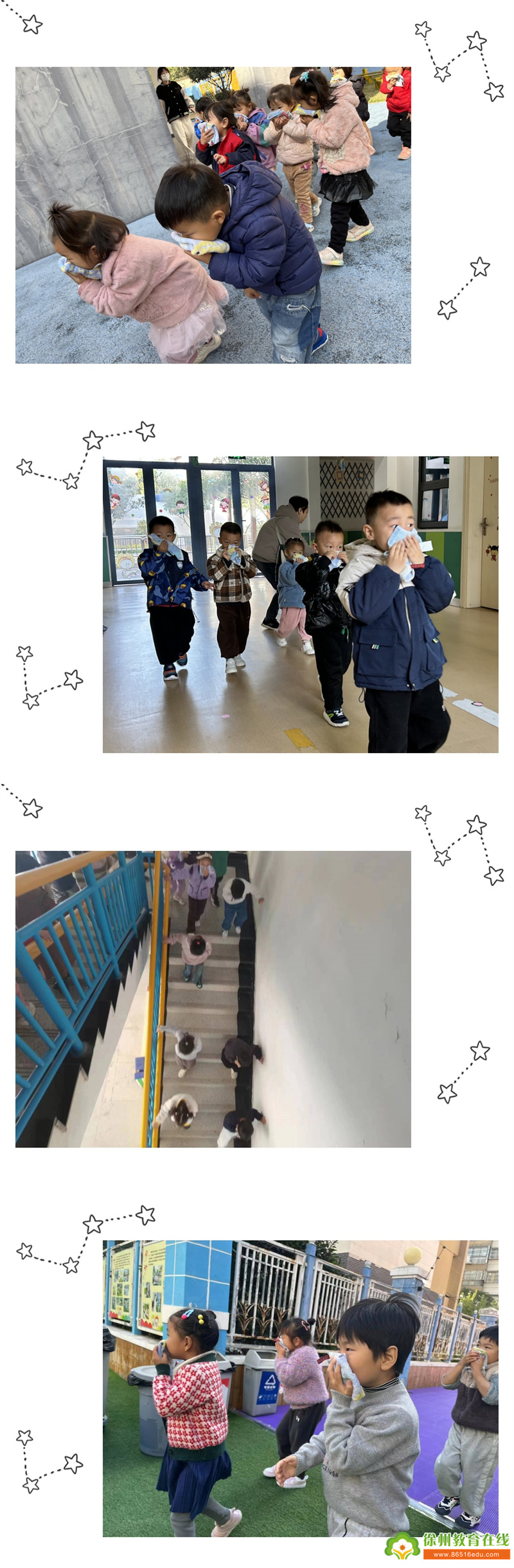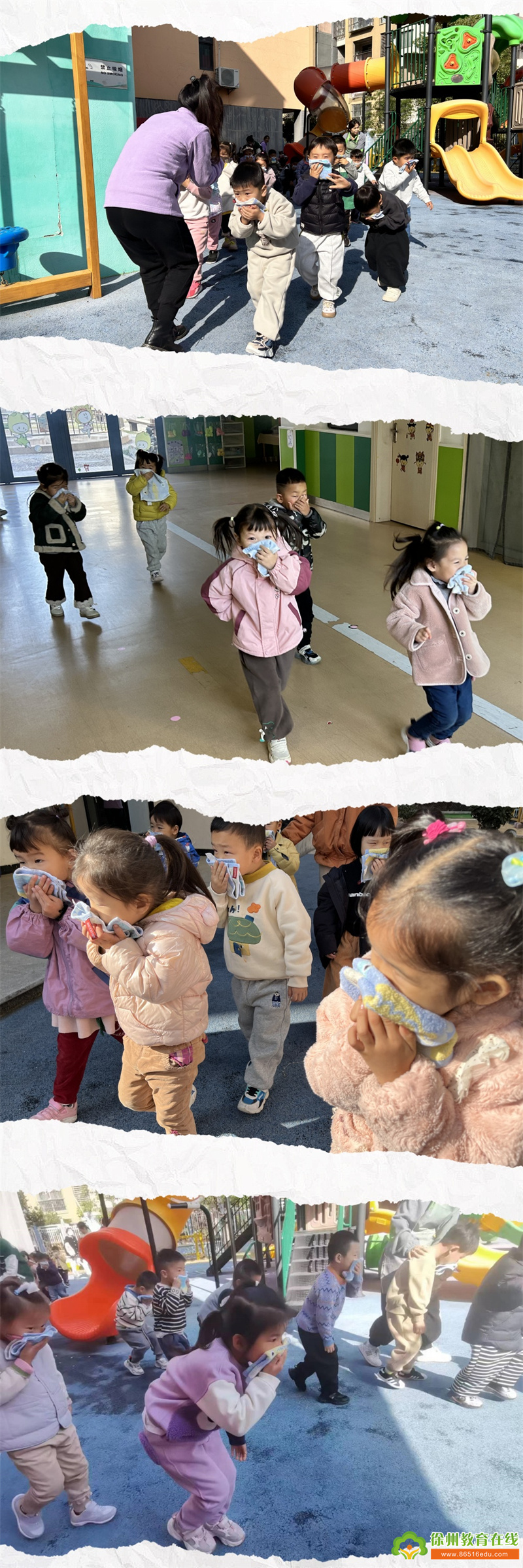 随着一阵急促的警报声,浓烟逐渐弥漫开来充满整个楼道,消防疏散演练正式开始了。在老师们的引导下,孩子们迅速按照预案的疏散线路,用毛巾或者手捂住口鼻,低姿势弯腰前行,从教室有秩序、不慌乱地沿着指定路线撤离到安全地带。
