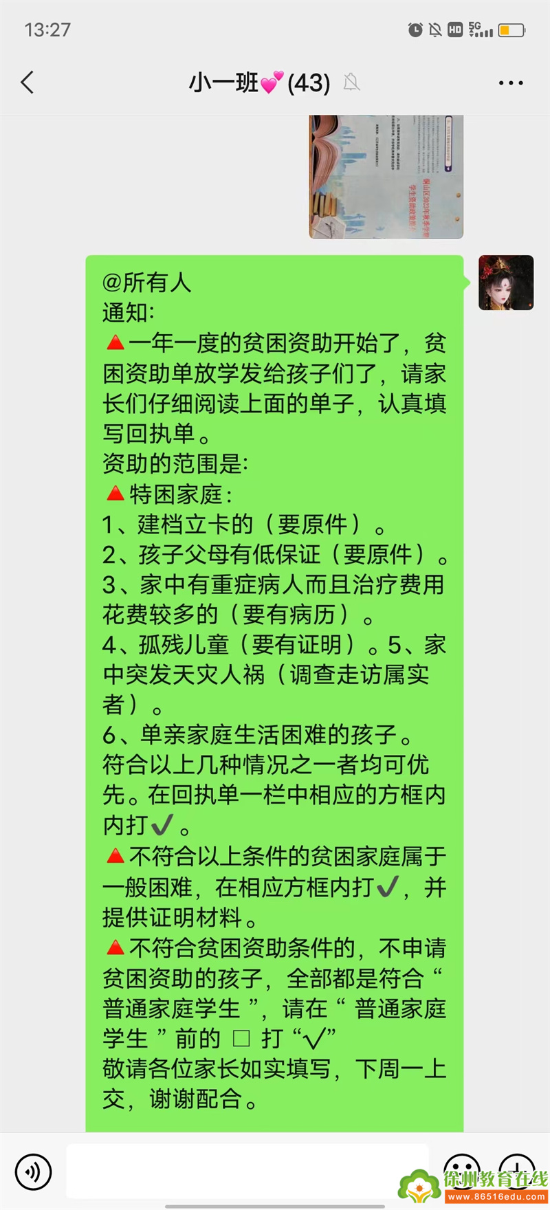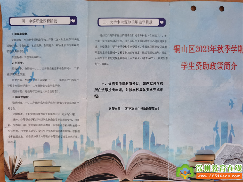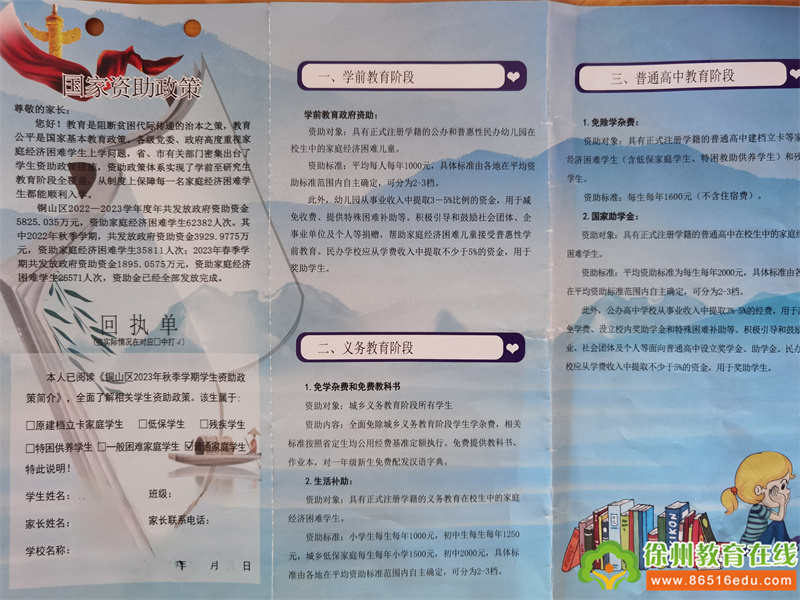 会后各班教师通过发放告知书、资助政策宣传栏等多种形式给家长讲解资助政策,向监护人告知家庭经济困难学生认定工作事项,并发放《铜山区2023年秋季学生资助政策简介》确保每位家长都了解资助政策,不漏掉任何一个人,确保让困难幼儿能够真正享受该项政策,以减轻家庭经济压力。