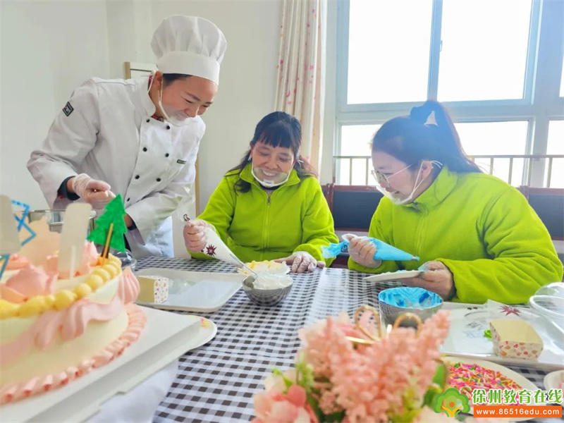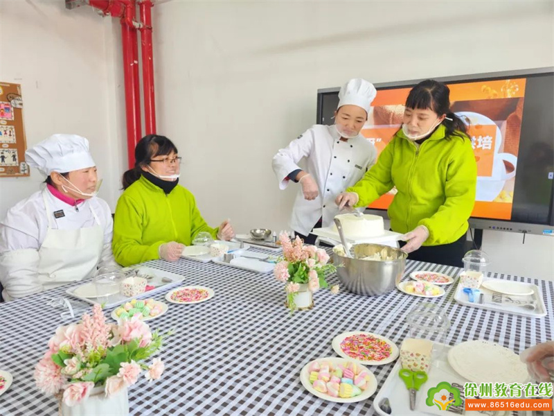 潘师傅现场示范了蛋糕胚的制作、打奶油的技巧及裱花工具的使用方法等制作要点并邀请厨师、老师们进行体验。