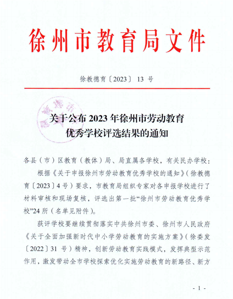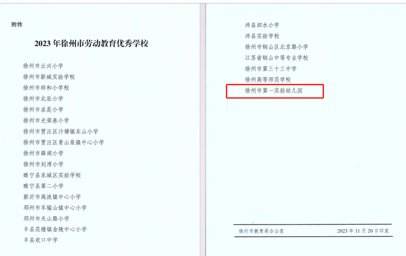 近日,徐州市劳动教育优秀学校评选中,徐州市第一实验幼儿园喜获殊荣,被授予“徐州市劳动教育优秀学校”称号。这一荣誉不仅是对我们辛勤努力的认可,更是为孩子们的成长画上了浓墨重彩的一笔。