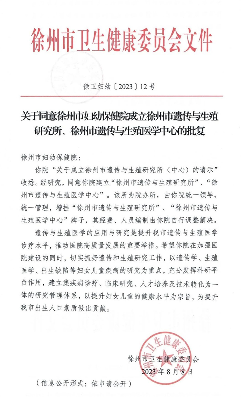 2023年8月,“徐州市遗传与生殖研究所”及“徐州市遗传与生殖研究中心”在徐州市妇幼保健院挂牌成立。作为徐州市遗传与生殖领域的排头兵,徐州市妇幼保健院着力突出妇幼健康服务特色,一直致力于打造政府放心、百姓满意的现代化高水平妇幼保健医疗中心。