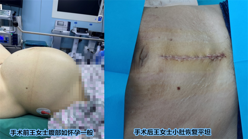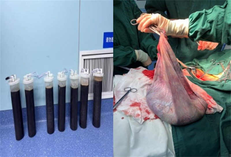 经过影像检查发现王女士的盆腔肿瘤来源于一侧卵巢,直径约45cm,且已经顶到肋骨,同时压迫膀胱、肠道等器官,如此巨大的肿瘤十分罕见。由于患者绝经多年,不能排除恶性肿瘤,肿瘤增长迅速需要尽快手术。