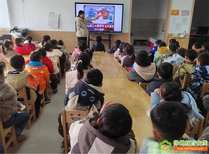 老师根据幼儿的年龄和认知特点,通过生动、形象的视频及图片讲解大雪节气的来历、习俗,引导孩子们初步认识大雪节气特点。