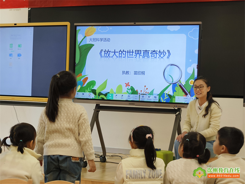 此节活动,苗老师创新将便携式手机放大镜与平板电脑相机功能结合,巧妙设计教学环节,结合希沃白板、易课堂等多种信息化手段,从多角度呈现现代信息技术与幼儿园科学活动的深度融合。让科学活动灵动化、游戏化,既激发了幼儿的探究兴趣,又拓宽了幼儿的经验视野,为幼儿发展提供了个性化支持的信息化学习环境,展示了别具特色的信息技术与活动融合的创新课程。