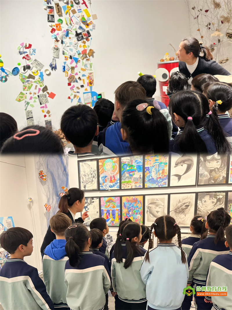 来到艺术展厅,孩子们被眼前的一幅幅作品、各种生活中不起眼的材料,如琐碎的布料、喝完的饮料瓶、掉落的树枝与落叶、废弃的杂志封面等材料,创作者们却它们利用起来创作出了不同的艺术作品,体现了废旧物品与美的结合。在听完老师对作品的解析后,一双双童真的眼睛充满了对艺术的渴望。