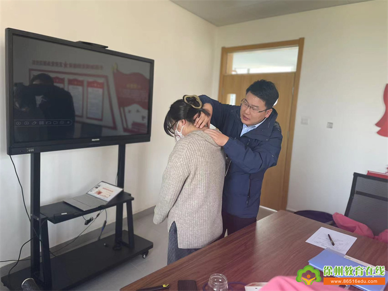 教职工在郭老师的指导下学习心肺复苏术的操作方法,在操作中对大家的操作技术、手法等进行现场纠正和指导,确保每一位教职工都能正确掌握。