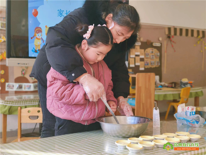 小班马浩然的妈妈,她准备了给孩子们准备了一节美食课烤蛋挞。马浩然妈妈用轻松、愉快的授课方式,把蛋挞的制作方法教给孩子们,很快,一缕缕香味飘散开来,温暖了整间教室。