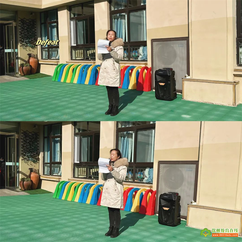 孟园长为本次亲子运动会致开幕词,鼓励小运动员们积极勇敢参与活动,希望孩子们在运动中挑战自我,在赛场上学会团结协作、互帮互助,同时预祝小运动健将们在趣味运动会中收获健康与自信。