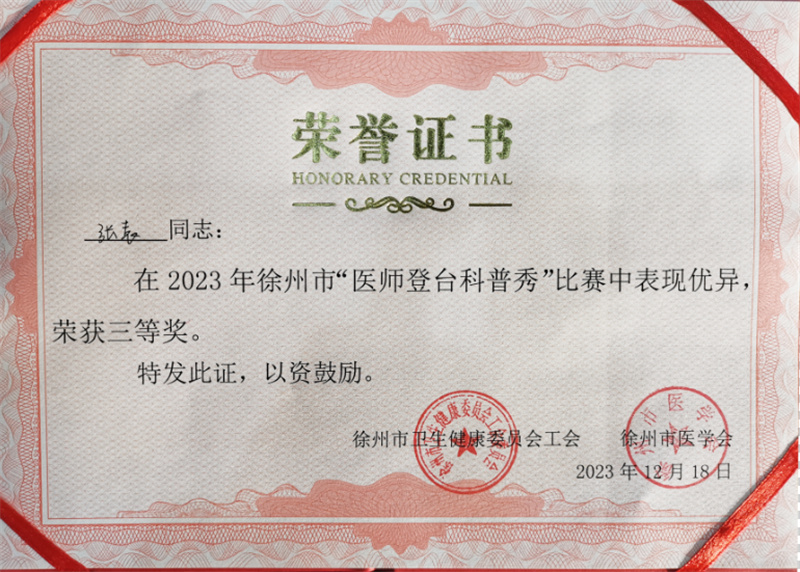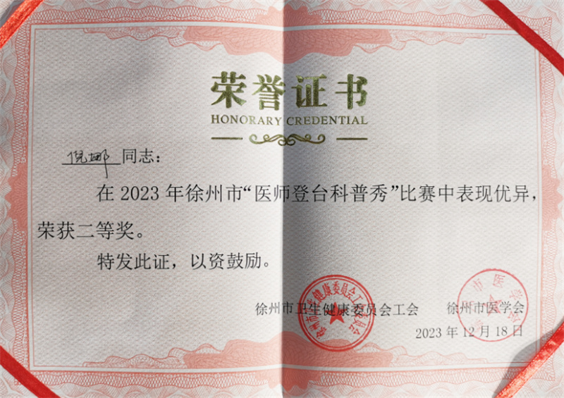 12月18日,徐州市卫生健康委员会工会委员会、徐州市医学会共同主办的2023年徐州市“医师登台科普秀”大赛总决赛在云泉山庄隆重举行。经各医疗机构推荐,40多名选手参加本次比赛,最终20名选手脱颖而出进入总决赛。徐州市儿童医院康复科医师倪娜、呼吸内一科医师张袁初赛顺利晋级,在决赛中发挥出色,分别获得2023年徐州市“医师登台科普秀”大赛二等奖、三等奖。