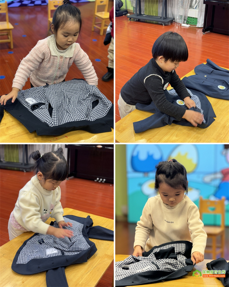 比赛过程异常激烈,有的宝贝紧张的翻不出袖子;有的宝贝叠的弯弯扭扭,但他们都没有哭泣和退缩,在老师和同伴的“加油”鼓励中不断尝试、坚持,一步一步完成比赛。