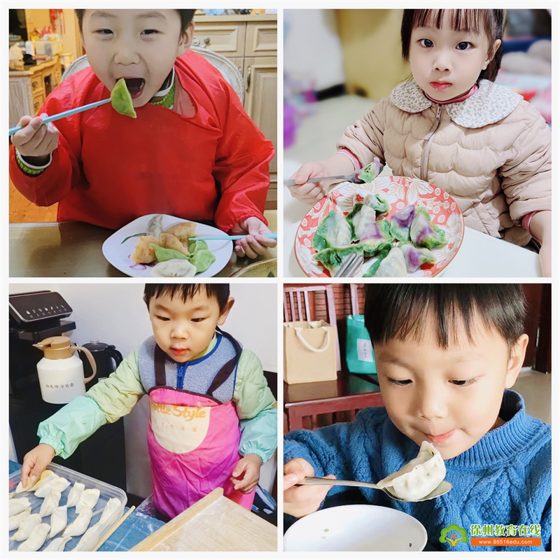 幼儿尝试自己动手包饺子,学习了擀饺子皮的技能,并能根据饺子皮的大小放入适量的馅料,捏紧饺子皮使馅料不漏。在包饺子的过程中,感受到了与同伴、家长一起包饺子的热闹气氛,品尝饺子时收获了成功的喜悦。