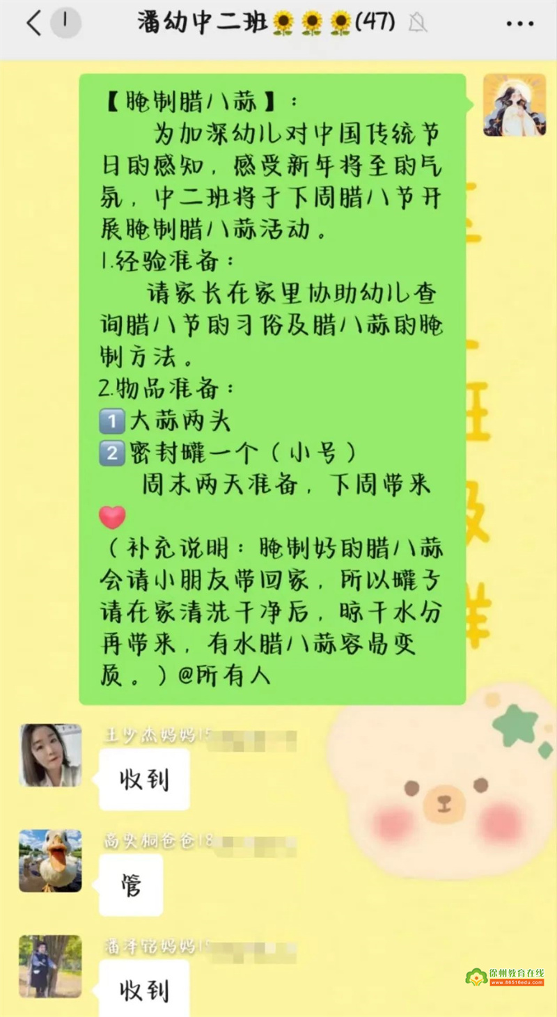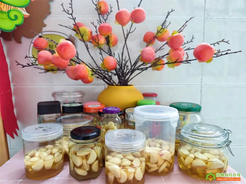通过家园合作,小朋友在家长的帮助下查询腊八蒜的腌制方法,并准备了密封的小罐子。