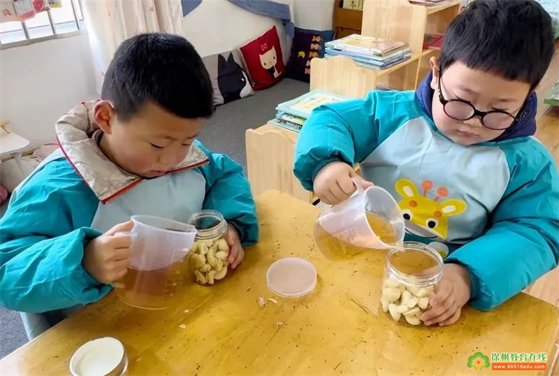 腌腊八蒜是腊八节的节日食俗。蒜辣和醋香融合在一起,是北方冬天独有的美味。制作腊八蒜是将剥了皮的蒜瓣儿放到一个可以密封的罐子里,倒入醋,糖,放到寒冷的地方。慢慢地,泡在醋中的蒜就会变绿,最后会变得通体碧绿,如同翡翠一般。 瞧!孩子们做的有模有样呢!