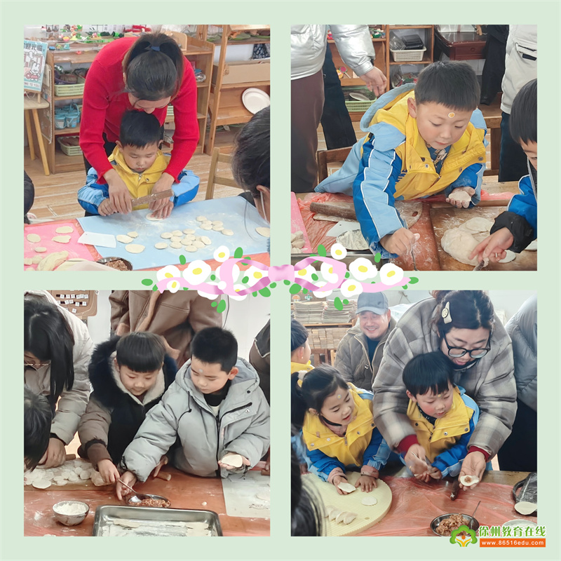 在孩子们的期盼中包饺子活动终于开始了,小朋友们拿出家里带来的面板、擀面杖,调好的馅等,家长们和孩子们一起揉面、切面、调馅、擀饺子皮等,孩子们在家长的指导下有模有样的包起来,瞧,一双双小手像在变魔术,一个个精致的饺子诞生了,有的弯弯的,像个月亮,有的鼓鼓的,像个元宝,一个接一个饺子越变越多。孩子们包出来的饺子虽然千姿百态,但各具特色。