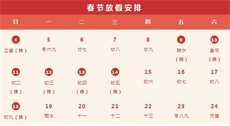 2月4日、2 月9日至2月14日、 2月18日放假。