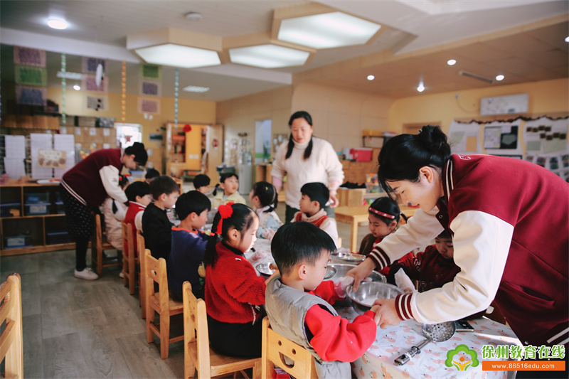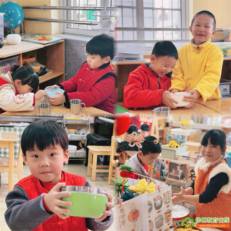 中班和大班的孩子们在老师的带领下准备了糯米面、馅料,洗好小手准备滚元宵啦!