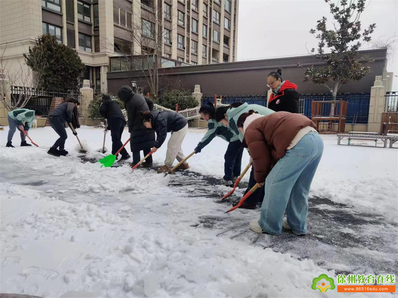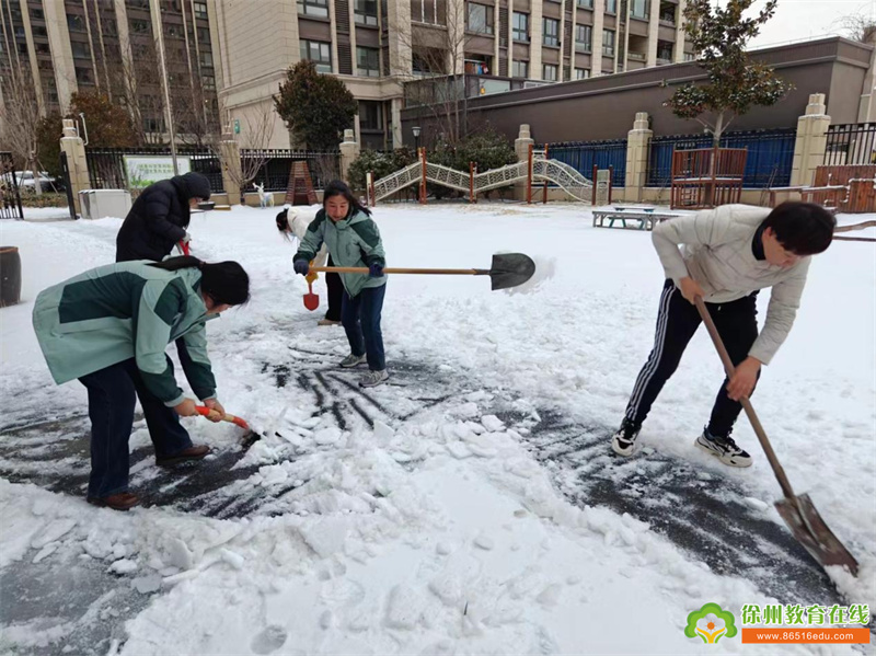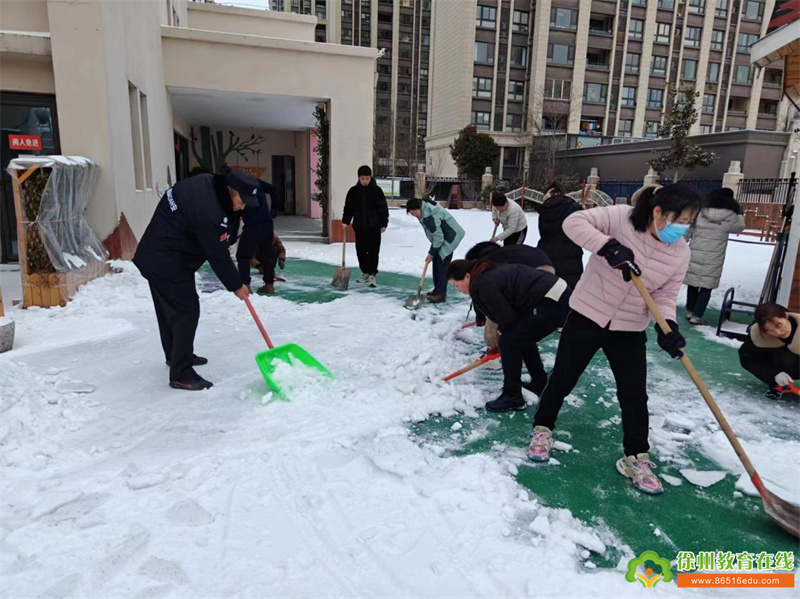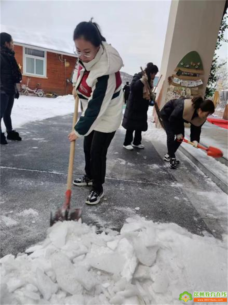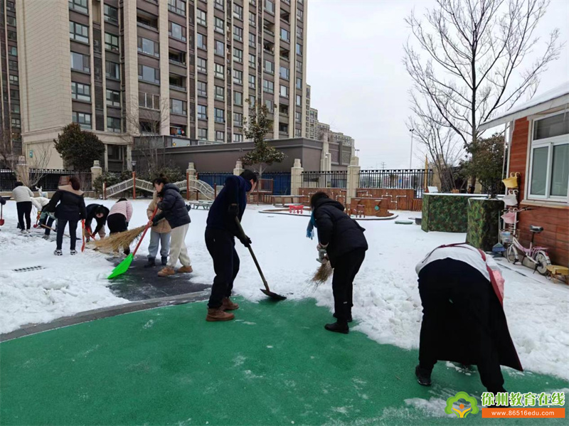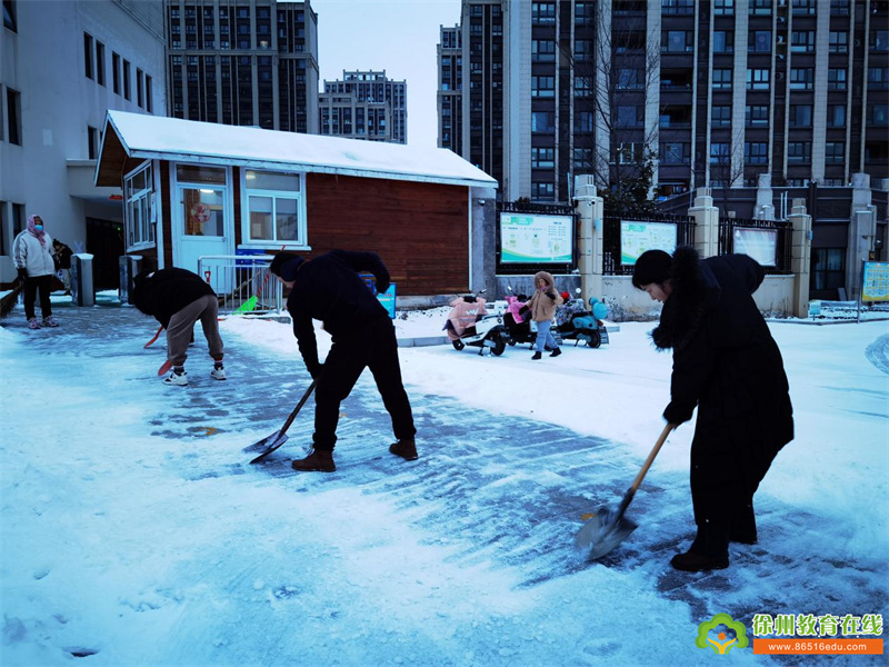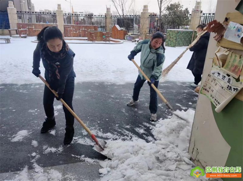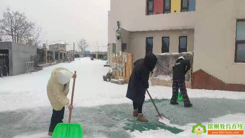 持续的降雪令幼儿园美不胜收,洁白的雪花为大家带来欢乐的同时,也给师幼的出行带来诸多的不便和安全隐患。为尽快消除积雪,排除隐患,营造一个安全的园所环境,徐州市丁万河幼儿园以雪为令,积极组织领导小组、成立以园长为组长、安全负责人丁长乐老师为副组长的应急小分队,启动应急预案,教职工积极清扫园内积雪,为寒冷的冬日带来丝丝暖意。