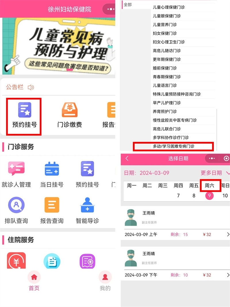 微信小程序“徐州市妇幼保健院”—“预约挂号”—“多动/学习困难专病门诊”