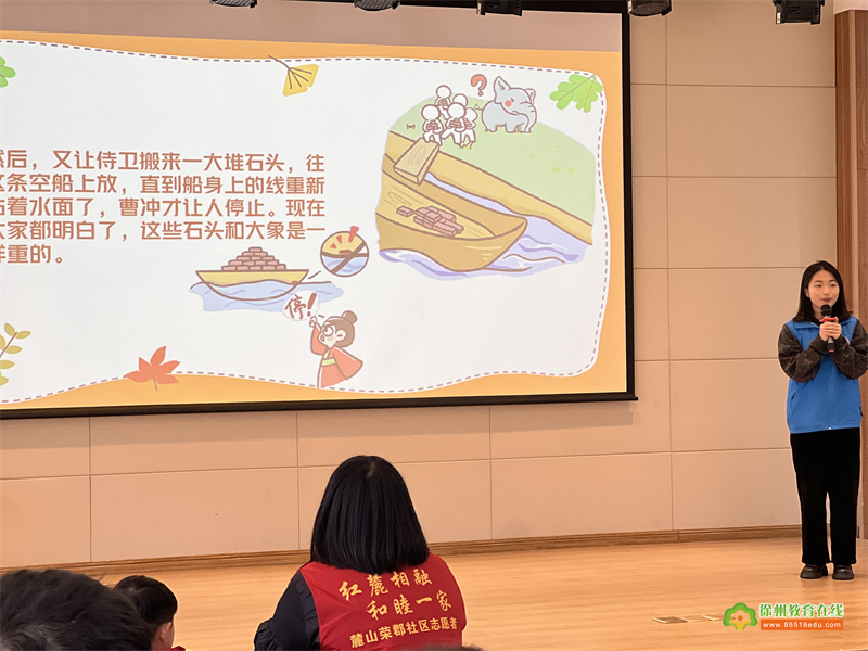 活动中,高校学生首先以“曹冲称象”的故事引入,从孩子们的兴趣出发,发散孩子思维,利用“动物中的数学天才”和“生活中处处有数学作品”激发孩子们的兴趣。