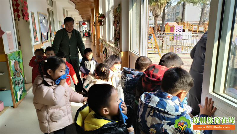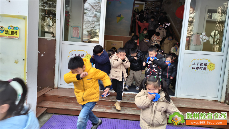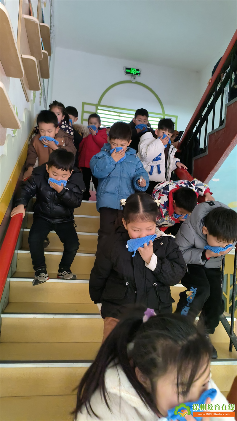 随着急速的警报声响起,各班幼儿在老师组织带领下弯着腰,用湿毛巾捂住口鼻,手扶楼梯栏杆,按疏散路线迅速有序撤离到安全场地。