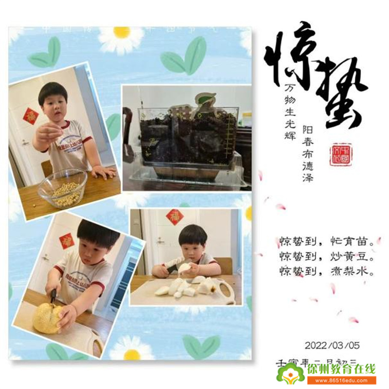 “小园得雨藓苔滋,不觉春来物候移。昨夜新雷又惊蛰,百虫凄抑助敲诗。—《惊蛰》李履庵”。孩子们阅读了关于惊蛰的故事绘本,感受惊蛰节气不仅是万物生长的好时节,亦代表着春耕的开始。