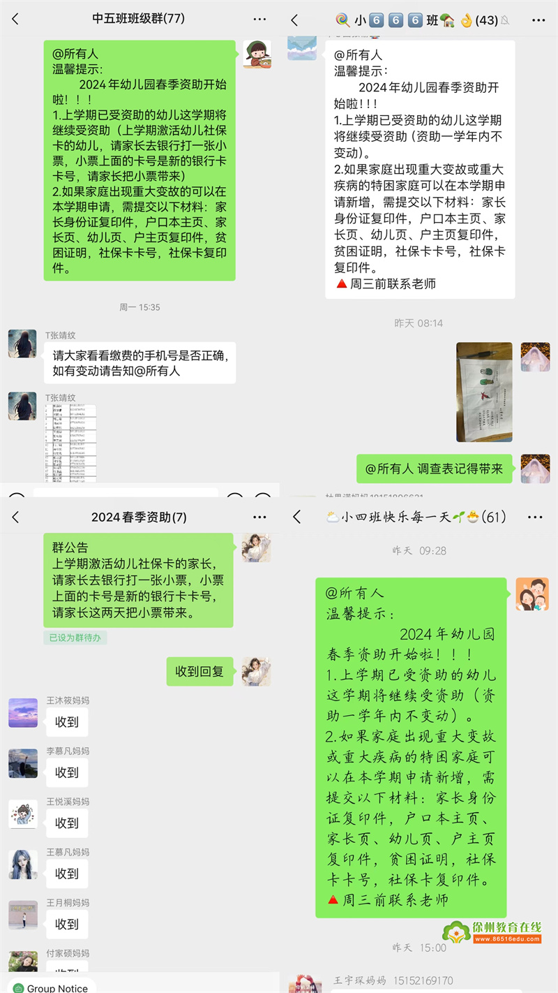 同时,要求各班在班级群转发资助通知,积极的向家长们进行宣传,让每一位家长了解学前教育资助的项目、对象、标准、办理流程等。
