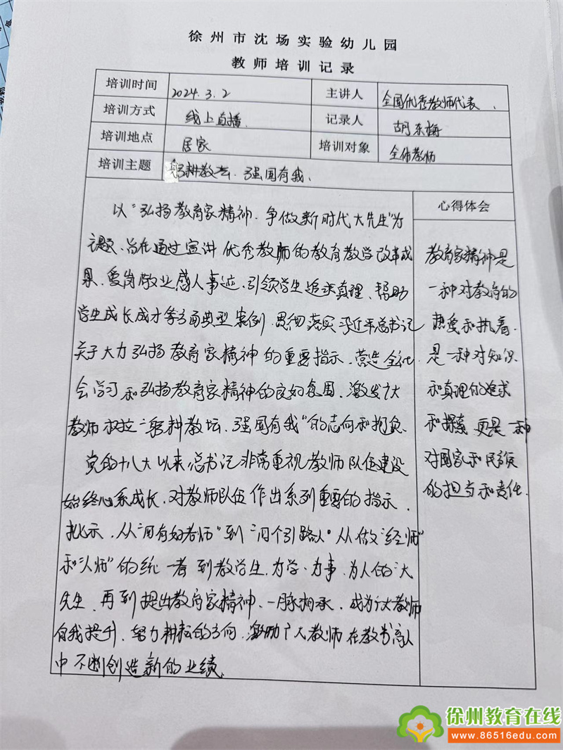 为做好大力弘扬教育家精神的宣传工作,激励教师践行教育家精神,2024年3月2日上午9点,沈场实验幼儿园积极组织了教师居家线上观看了教育家精神巡回宣讲活动。